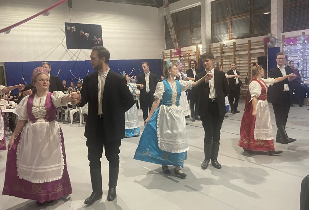 Az est a városlődi Pergő-Rozmaring Táncegyüttes hagyományos megnyitó báli táncával, a palotással – a művészeti vezetők, Petres Ákos és Petresné Reiter Andrea koreográfiájával – kezdődött. A 2022-ben harmadik arany minősítését is megszerző, Pro Cultura Minoritatum Hungariae” Díjjal kitűntetett, a Veszprém Vármegyei Értéktárba is bekerülő táncegyüttes idén már harmadik alkalommal támogatta fellépésével iskolánk jótékonysági bálját.